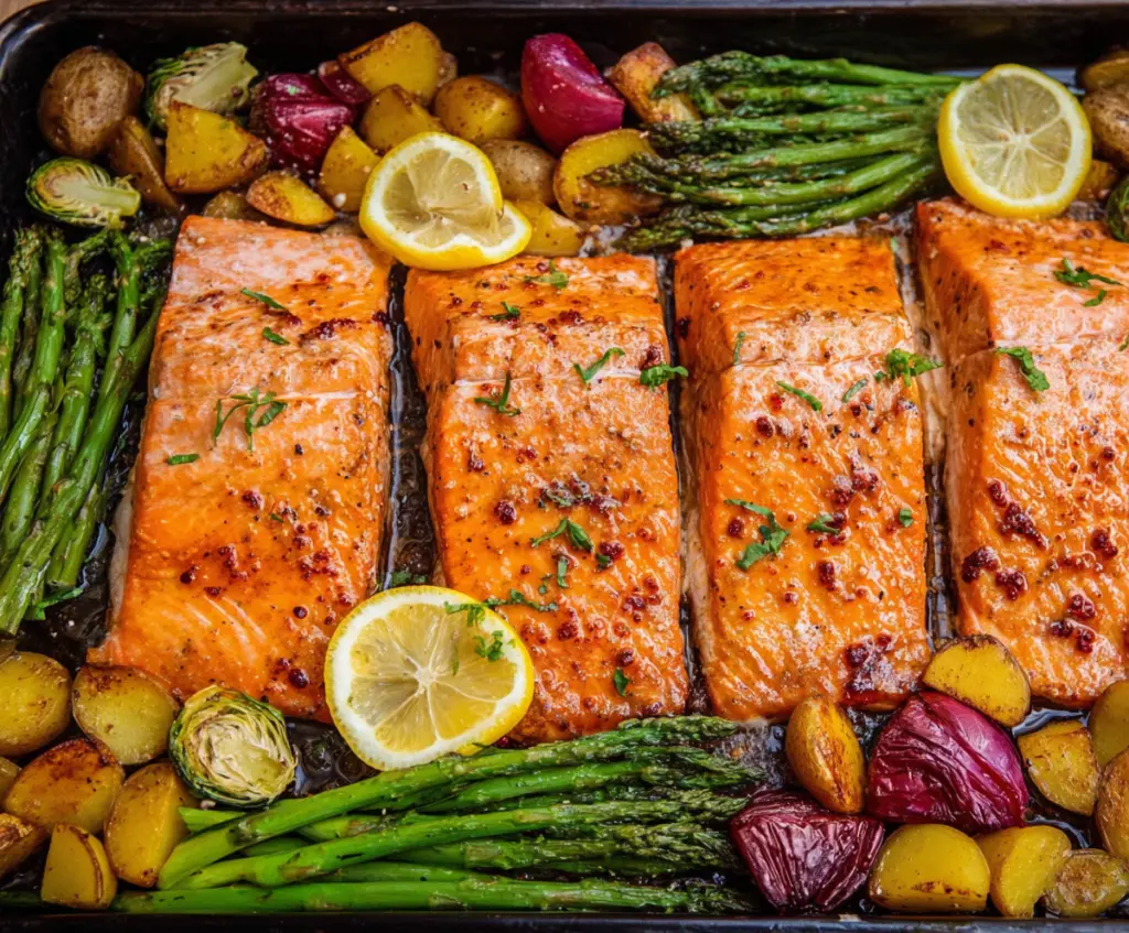 Roast everything in the oven for 15-18 minutes, until the salmon flakes easily with a fork and the vegetables are tender and slightly caramelized.